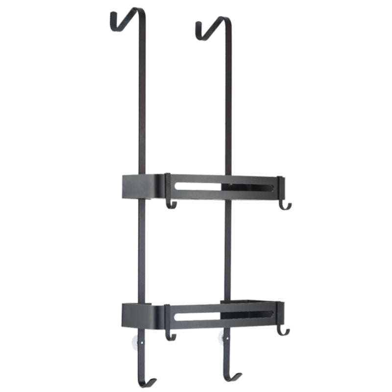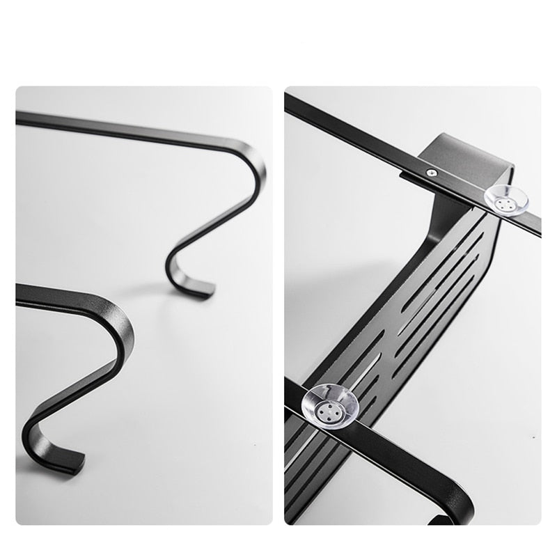 Denne innovative brusehylde er skabt til at maksimere pladsen i din bruseniche. Med to rummelige niveauer får du masser af plads til alle dine bruseprodukter, fra de største flasker til de mindste tuber. De smarte kroge nederst er ideelle til at hænge barbermaskiner, vaskeklude eller svampe, så alt har sin faste plads. Det åbne design sikrer god ventilation og dræning, hvilket forhindrer ophobning af vand og sæberester, og holder dine produkter tørre og hygiejniske. Den minimalistiske, sorte stil passer perfekt ind i de fleste moderne badeværelsesindretninger og skaber en følelse af ro og orden.