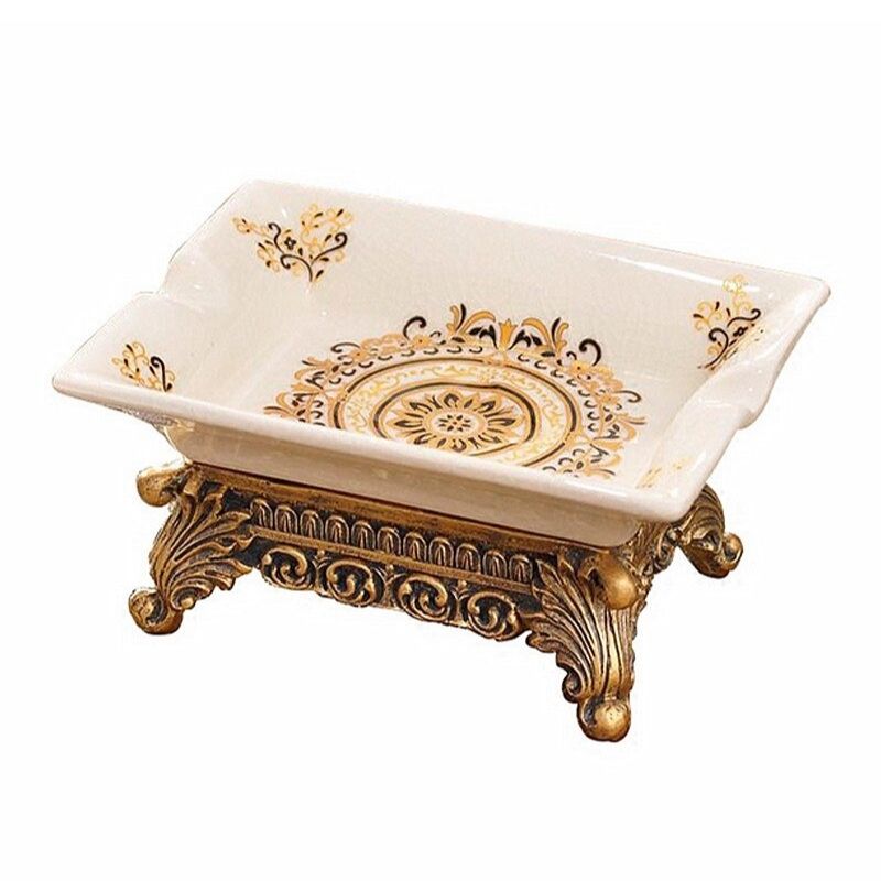 Vores forgyldte vintage sæbeholder skiller sig ud med sit detaljerede mønster og sin smukke gyldne finish. Den hvide keramiske skål er prydet med elegante sorte og gyldne ornamenter, der afspejler en klassisk æstetik. Hvert enkelt mønster er omhyggeligt udført for at skabe en harmonisk og luksuriøs helhed. Den solide, forgyldte base, som er rigt udsmykket med bladmotiver og snoede detaljer, løfter sæbeskålen elegant og tilfører et majestætisk udtryk. Denne sæbeholder er et vidnesbyrd om, at selv de mindste genstande kan være storslåede, når de er lavet med passion og præcision.