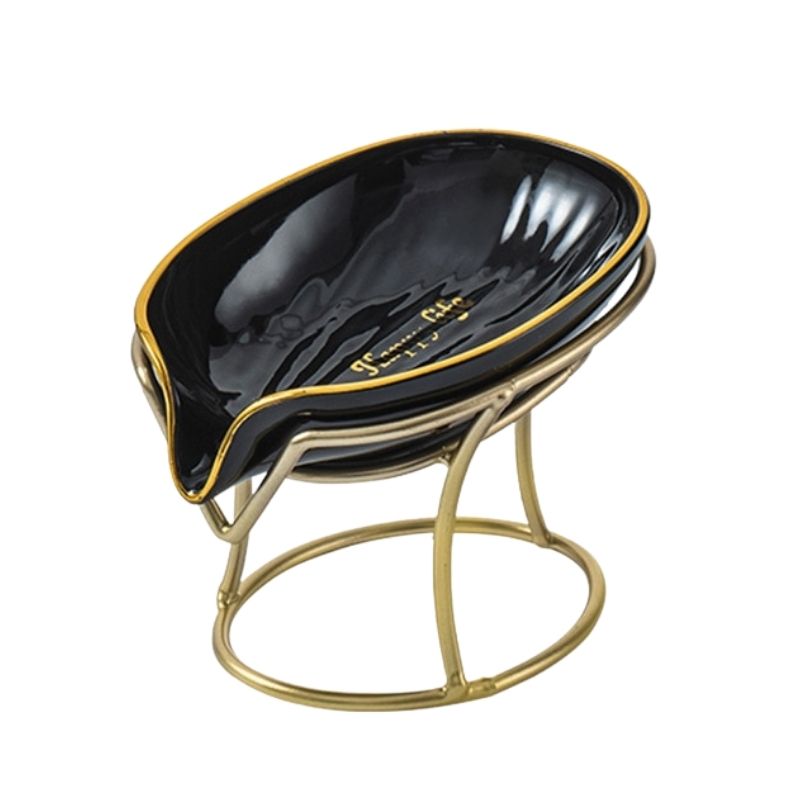 Denne sæbeskål skiller sig ud med sit unikke og iøjnefaldende design. Skålens sorte, blanke overflade er indrammet af en elegant gylden kant, der giver en følelse af eksklusivitet. Stativet, fremstillet af holdbart gyldent metal, løfter sæbeskålen, hvilket ikke kun er praktisk for at holde vand væk, men også tilføjer en vertikal dimension, der gør sæbeskålen til et dekorativt element i sig selv. Den buede form er inspireret af naturen, hvilket giver en blød og organisk følelse, der passer ind i mange indretningsstile, fra det moderne minimalistiske til det mere klassiske og overdådige. Det er en investering i både stil og hygiejne, der vil glæde dig hver dag.