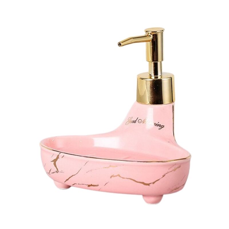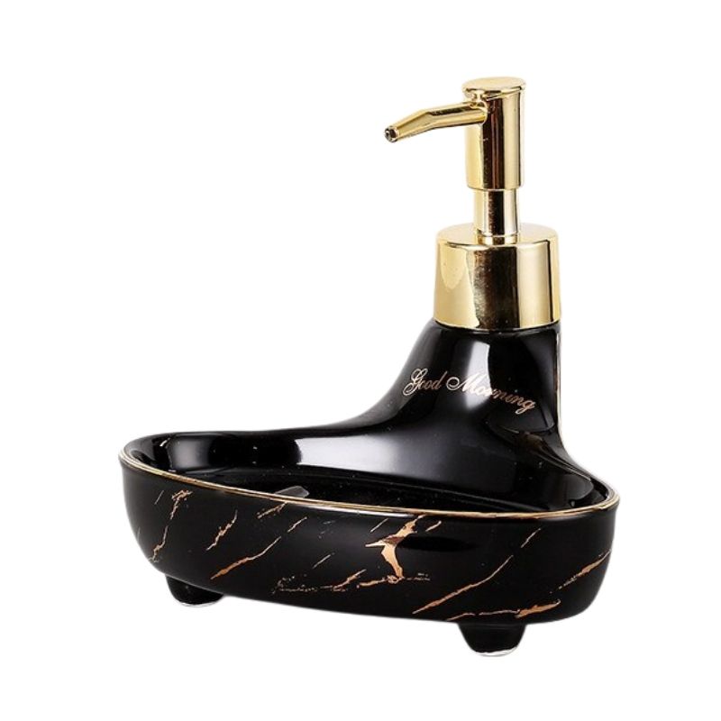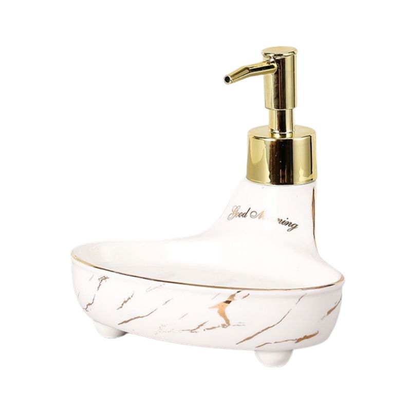 Forvandl dit badeværelse eller køkken til et stilfuldt og funktionelt rum med vores smukke sæbedispenser med integreret sæbeholder. Dette er ikke bare en almindelig sæbedispenser – det er et designstatement! Den hvide base med et raffineret guld-marmorlook giver en luksuriøs følelse, mens den skinnende guldfarvede pumpe tilføjer et touch af glamour. Den smarte "Good Morning" indgravering på dispenseren er en charmerende detalje, der byder dig velkommen til en frisk start på dagen. Forestil dig, hvordan dette sæt vil løfte indretningen og gøre hverdagsrutiner lidt mere fornøjelige. Den er perfekt til både håndsæbe og opvaskemiddel, og den praktiske holder sørger for, at din sæbe altid er lige ved hånden.