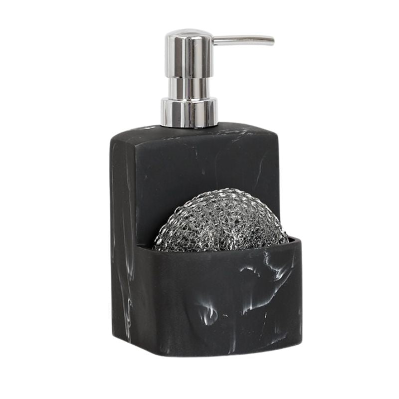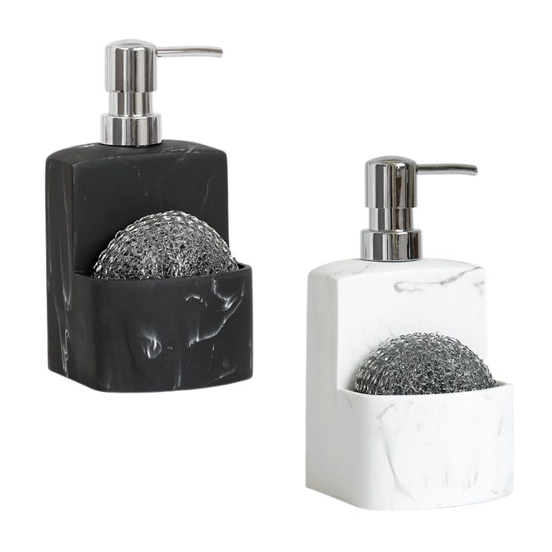 Gør dit køkken mere organiseret og stilfuldt med vores elegante sæbedispenser, der smart integrerer en svampeholder. Denne løsning er designet til at spare plads og holde dit køkken ryddeligt, så du nemt kan finde din svamp, når opvasken kalder. Den sorte marmorlook giver et moderne og sofistikeret præg, der passer ind i de fleste køkkendekorationer.